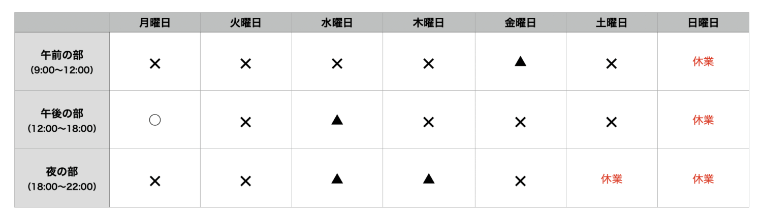 ご予約の曜日・時間帯は固定制ではありません。下記は目安としてご覧ください。
